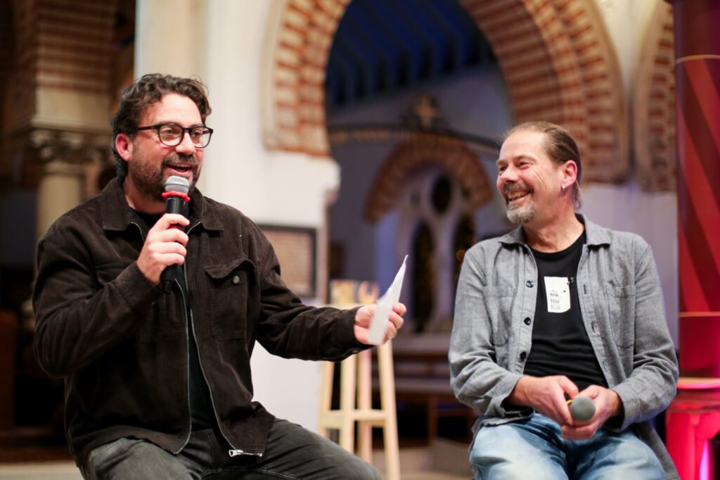the fringe dweller book launch was buzzing! thank you so much to everyone who came. jeremy woodham kindly took photos which are in an album here. we spent the day getting ready hanging 12 illustrations from the book from the balcony. things kicked off with drinks and matt playing tunes. this was followed by joy in conversation with david and i about the book and how we went about it. joel chipped in on his incredible design and cover and jon joined on zoom to talk about the wonderful illustrations which just lift the book. we had invited 6 artists to respond to either the book as a whole of one chapter. that was so good – tina hodgett read a liturgy that features in the book, chris read performed a new song, iva had done four paintings, martin wroe read a poem, iain cotton showed two sculpture tiles, and harry baker landed it with an amazing reverse poem. then it was signing – so many people bought books! we even ended up with a spontaneous after party at ours…